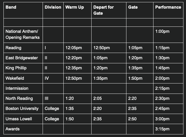 SOUTHEAST DISTRICT Sunday, October 19th, 2025 - 1:00pm Norwood High School Host: Steve Conant Please click here for warm-up, and performance times. |